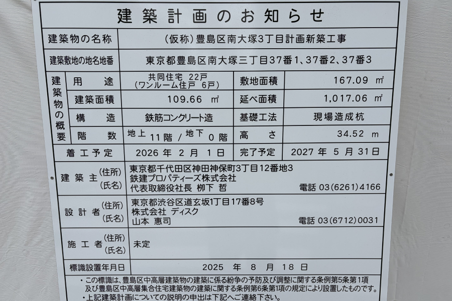 「豊島区南大塚3丁目計画」の一環であり、完成予定の共同住宅は、鉄筋コンクリート造で11階建てになるようです。