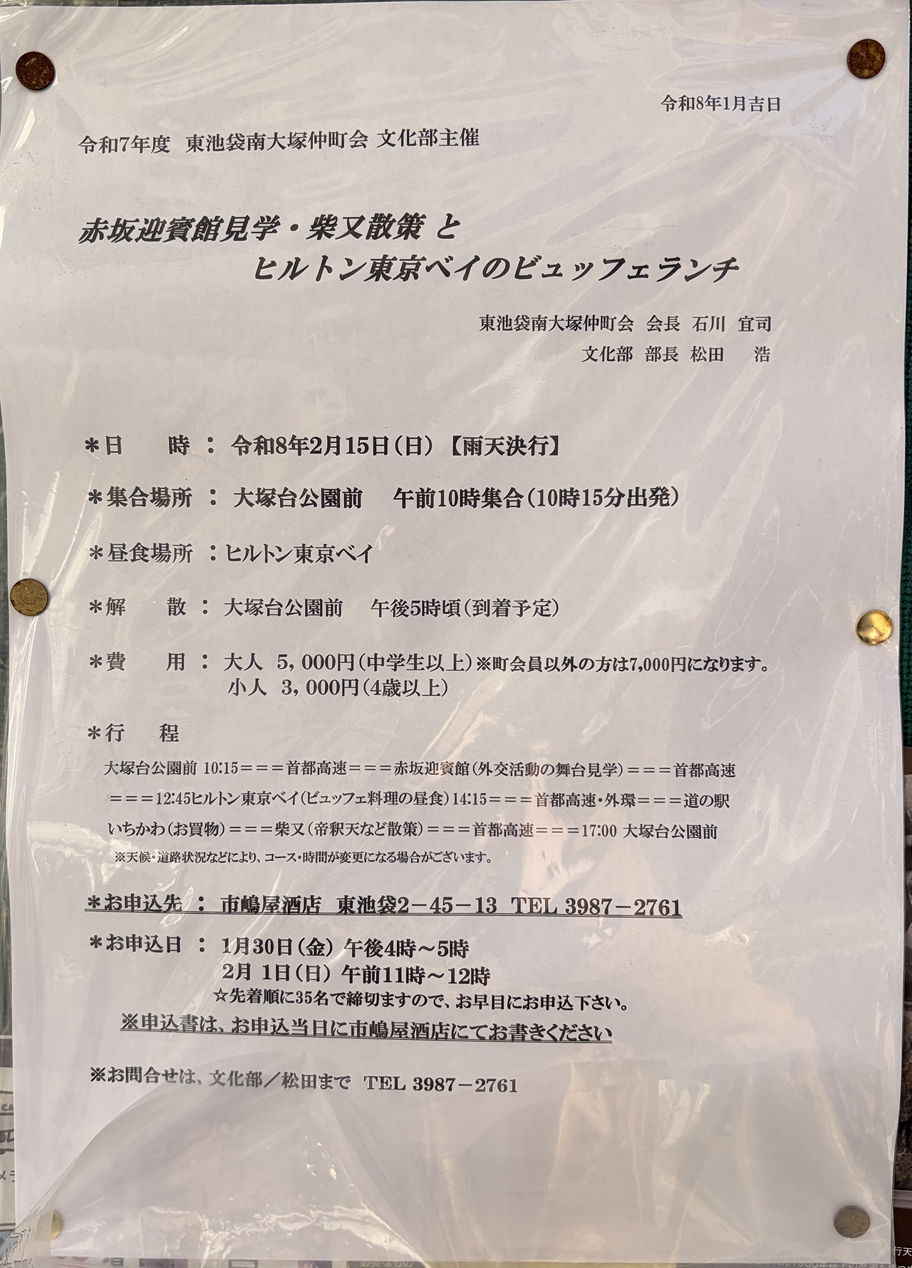2月15日(日)に東池袋南大塚仲町会が主催となり、『赤坂迎賓館見学・柴又散策とヒルトン東京ベイのビュッフェランチ』が開催されるようです!