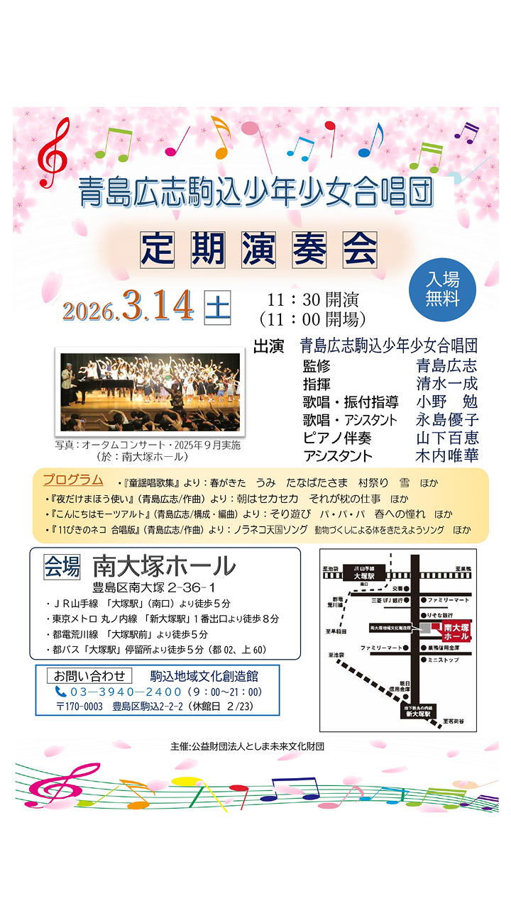 詳細日程 2026年3月14日(土曜) 開場時間 11時 開演時間 11時30分 出演/講師 出演:青島広志駒込少年少女合唱団
