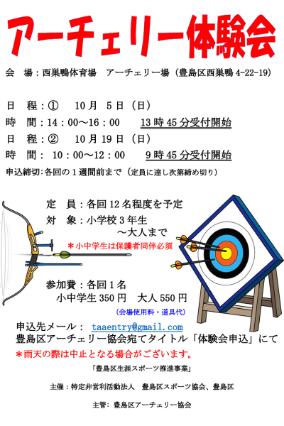 そんなわけで、『アーチェリー体験会』が10/5(日)・10/19(日)に開催されます!