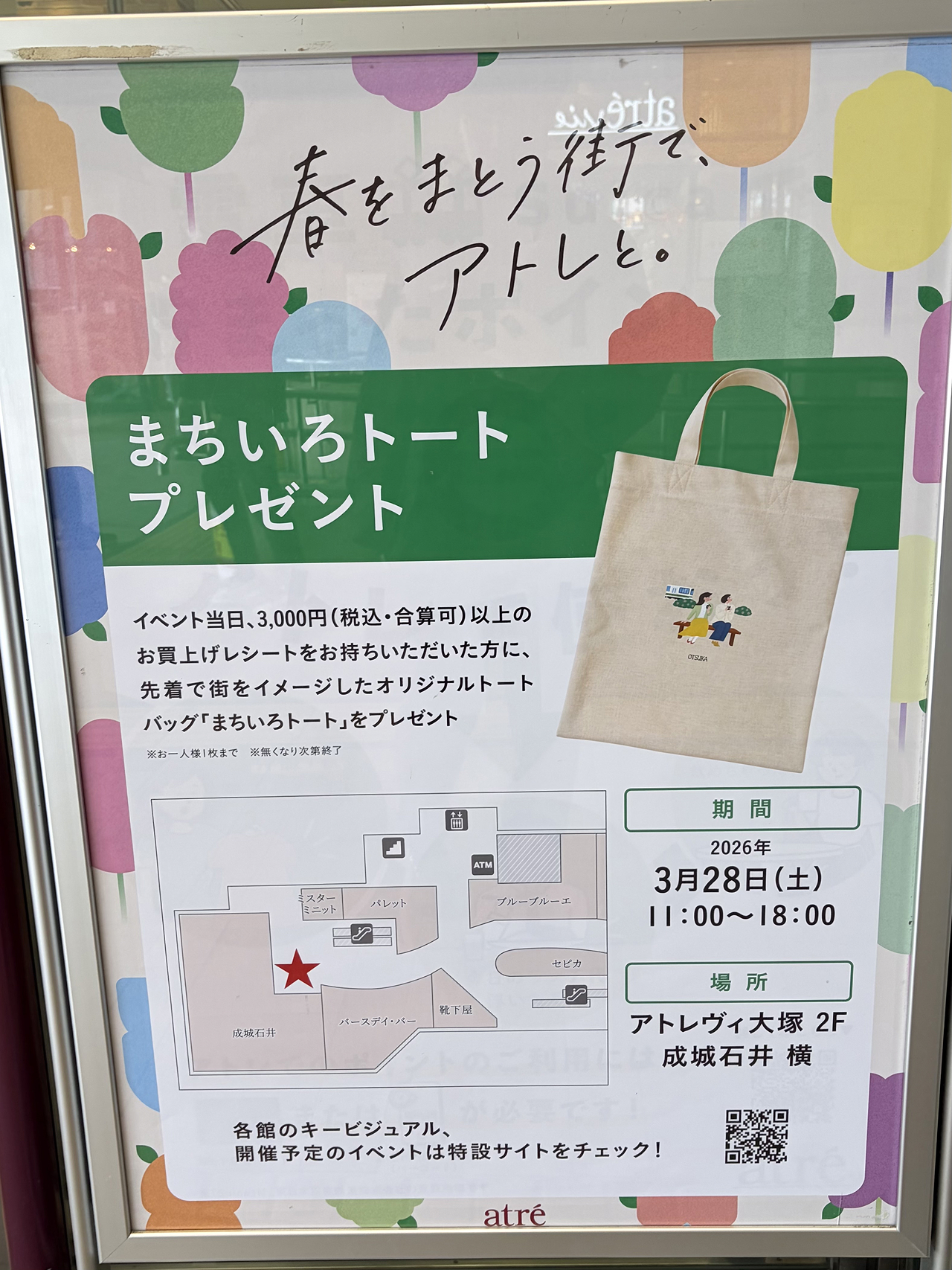トートバッグは無くなり次第終了の先着順となるようですので、土曜日はアトレヴィ大塚へお早めに!