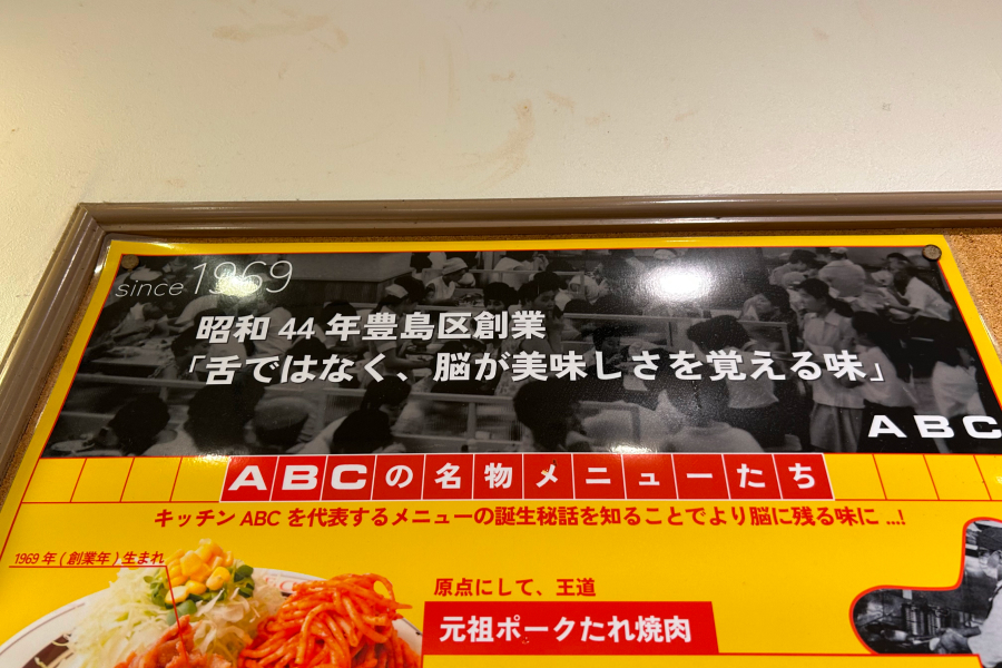 店内の壁には、『キッチンABC』の歴史と共に、「舌ではなく、脳が美味しさを覚える味」のキャッチコピーが。
