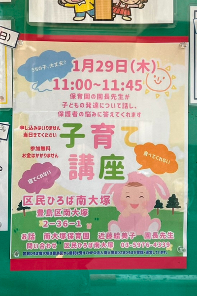 子育て中のお母さん・お父さんたちに嬉しいイベントが、『区民ひろば南大塚』で開催されます!