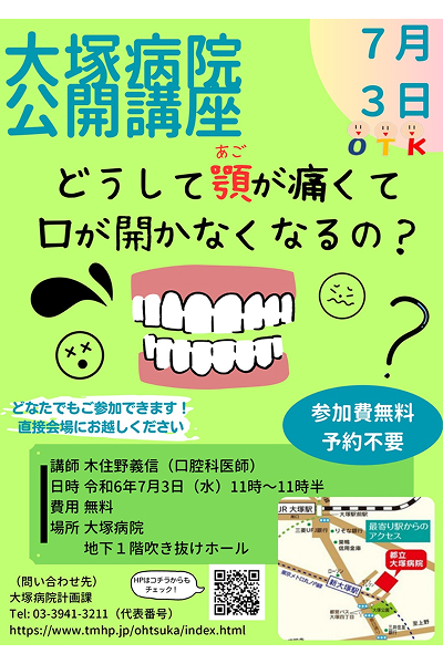 | イベント名 | 大塚病院 公開講座「どうして顎が痛くて口が開かなくなるの?」 |
