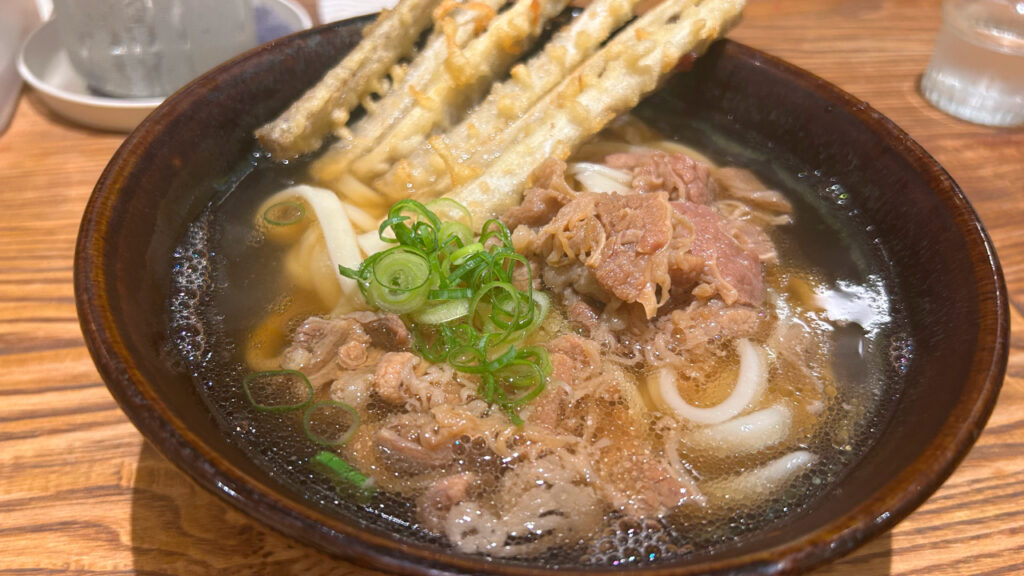 スープには本来のダシの良さはもちろんのこと、肉とごぼう天から出てくるものとも組み合わさって、