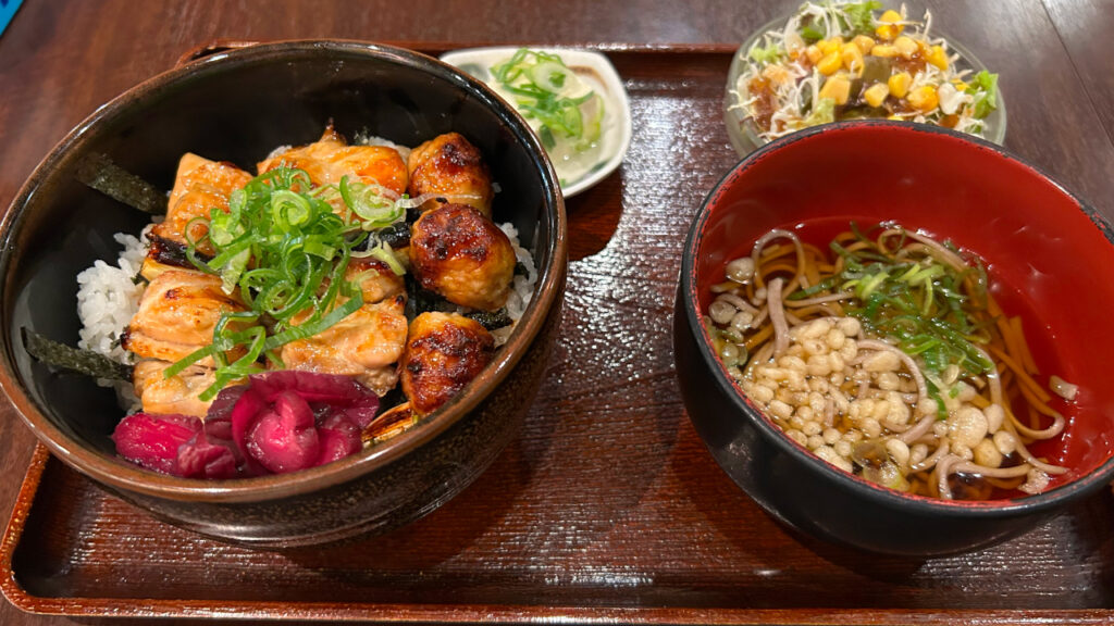 光り輝く焼きとり丼の他にも、そば、冷奴、サラダがついてきます。