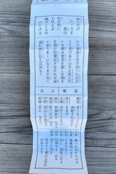 ついこの間もお店のおみくじを引いて大吉が出ましたが、今回は神社のおみくじ。